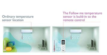 Follow Me "Follow Me” is a unique built-in feature in the remote controller. When activated, the indoor unit will sense the setting temperature according to where the remote controller is placed, resulting in a more precise and comfortable cooling.