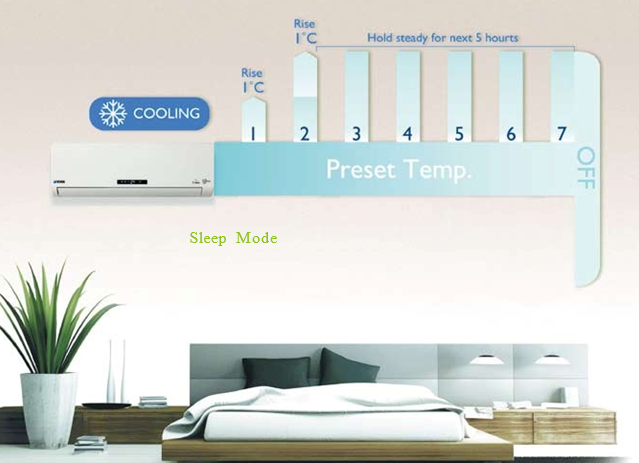 Sleep Mode The Sleep Mode feature increases the room temperature setting automatically by 1˚ C after the first and second hour, thereafter holding a steady set temperature for another five hours before switching off, providing you with a comfortable night sleep and ensuring maximum energy efficiency.
